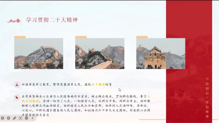 会议最后,为深入学习党的二十大,结合学生会实际工作情况推进学生会学习大会精神走心、走实、走深,坚定不移跟党走,充分发挥先锋模范作用,做到把学习成果转化为提升素质能力、破解工作难题,践行学生会宗旨,切实做到为学生服务,支部组织开展了第一次主题团课学习。杨天麒同领学党的二十大报告,带领学生会支部全体团员深刻体悟十年来的伟大变革,学习 “三个务必”精神,做到坚定不移听党话、跟党走,怀抱梦想又脚踏实地,敢想敢为又善作善成,立志做有理想、敢担当、能吃苦、肯奋斗的新时代好青年。