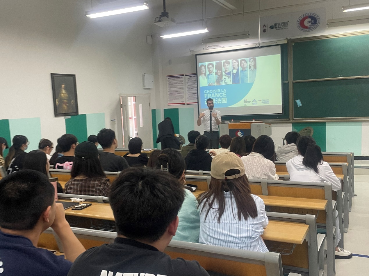 5月19日下午,法国高等教育署成都中心负责人李奥力先生和法国高等教育署成都中心宣传与推广项目官员林小石先生来访9728太阳集团,并为法语专业、中法2+2项目及工商大学外国语学院法语专业的同学们带来了关于法国高等教育的宣传说明会。说明会内容涉及法国高等教育优势、留学专业选择及法国高等教育署提供的免费支持。说明会期间,李奥力先生愉快地回答了同学们的提问。