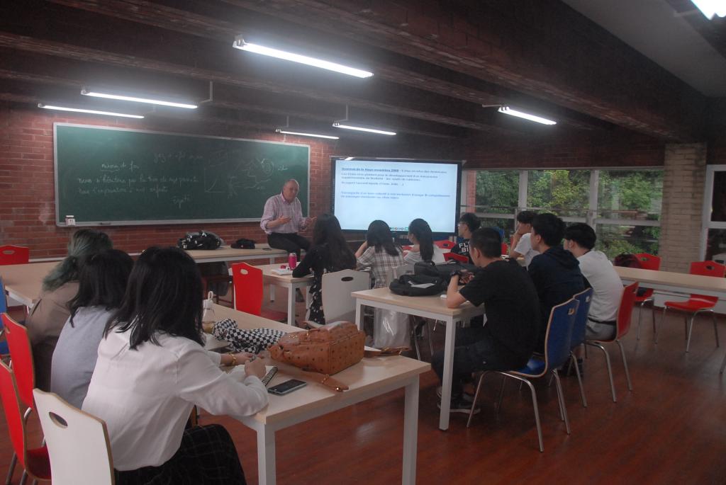 我院中法2+2交流项目学生于5月21-30日迎来法国马赛大学、蒙彼利埃大学、里昂大学的短期教学和接受选拔。法国合作大学对学生进行了法语、经济(宏观、微观)、数学方面知识的教学与测试,对学生取得的成绩给与了肯定,同时对学生也提出了希望和要求。我院2+2中法交流学生正积极准备接受法国大学的选拔,为进一步能继续在法国的学习做积极的准备。
