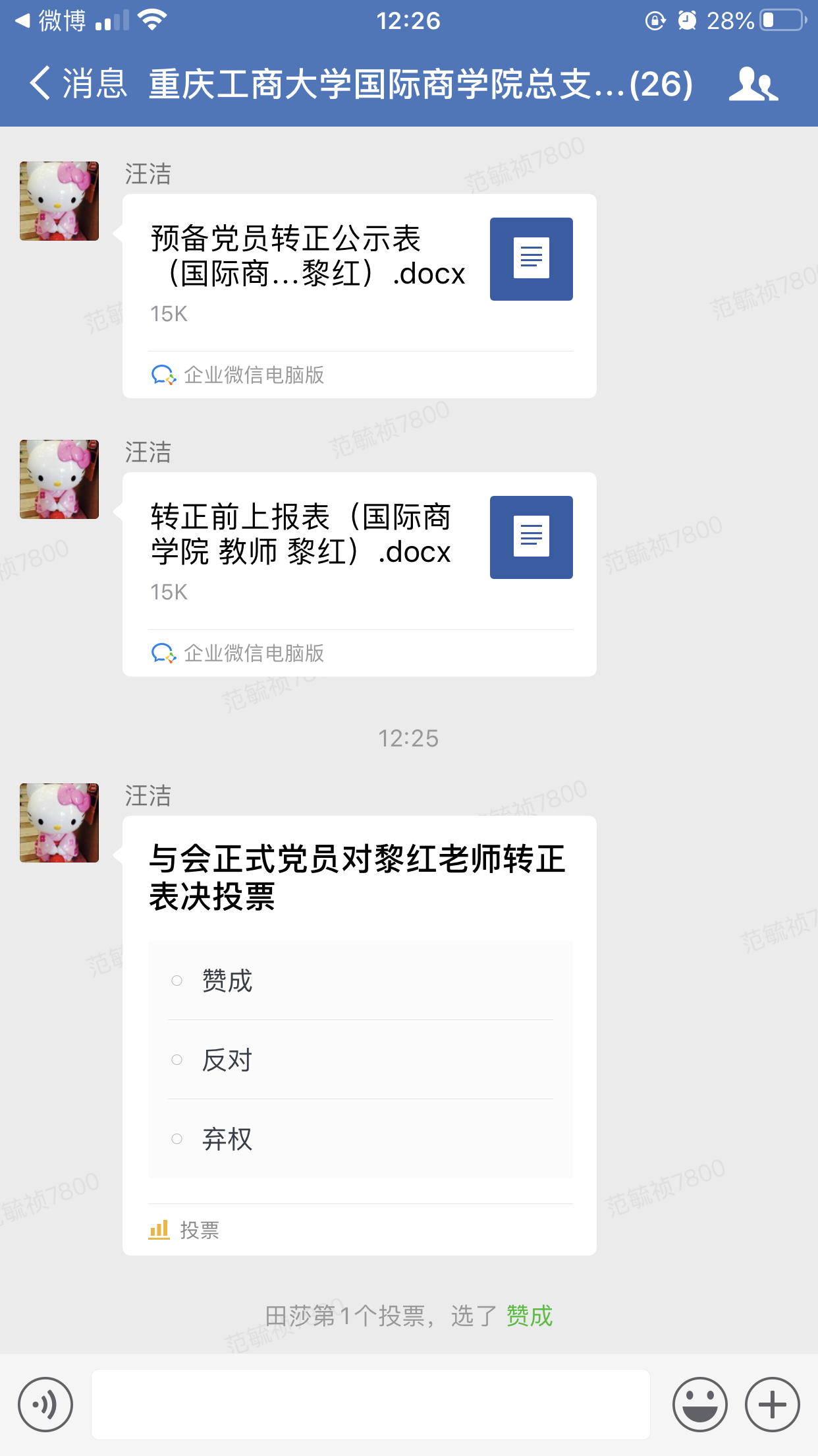 2020年3月26日,中共9728太阳集团总支学生二支部在企业微信群召开了3月份的支部大会,本次会议主要讨论了黎红老师的转正问题并对本学期的主题党日活动进行了安排。学生二支部书记汪洁老师,党支部王娟老师、田莎老师及二支部全体成员参加了本次大会。支部大会应到26人,实到26人。