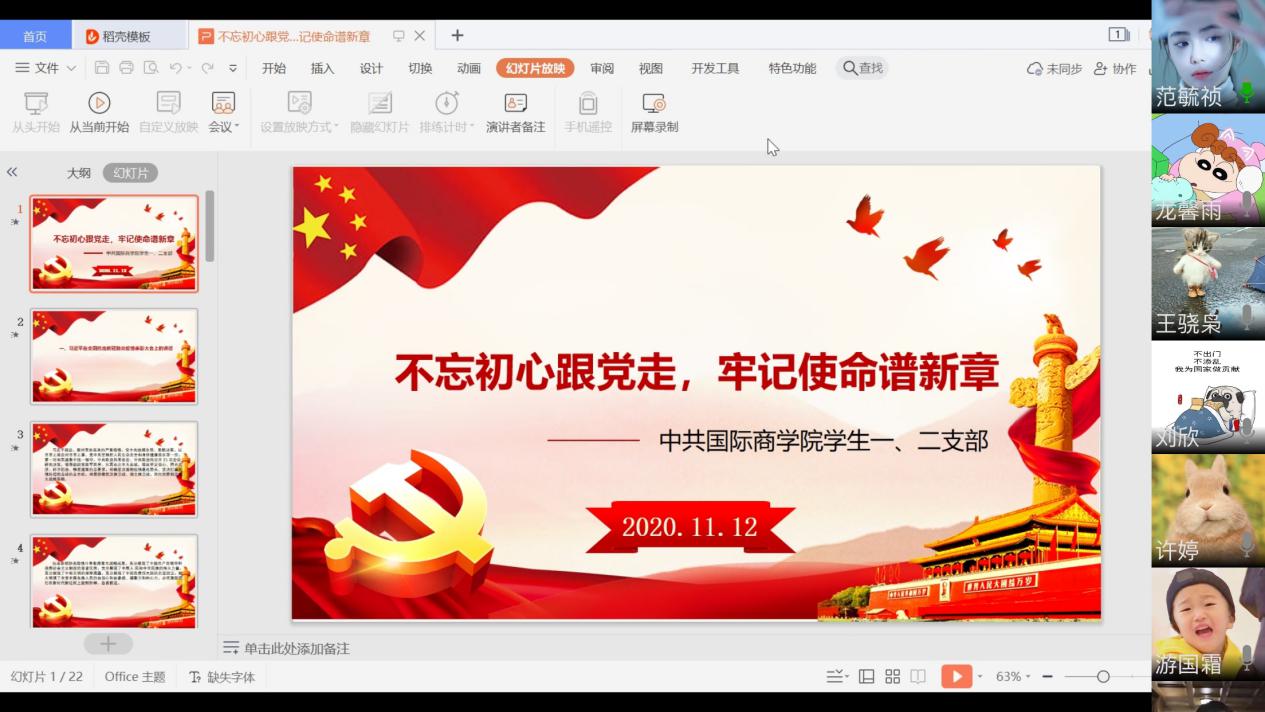 本次大会主是开展“不忘初心跟党走,牢记使命谱新章”专题学习。由范毓祯同学介绍开展专题学习会的相关背景与相关环节并带领大家学习习近平在全国抗击新冠肺炎疫情表彰大会上的讲话、中共中央办公厅印发《关于巩固深化“不忘初心、牢记使命”主题教育成果的意见》、习近平出席第三次中央新疆工作座谈会并发表重要讲话等相关内容,通过范毓祯同学介绍近期总书记的重要讲话精神,我们深知,面对突如其来的疫情,我们要坚持党中央的领导,坚定信心、同舟共济、科学防治,青年是国家和民族的希望,青年一代要不怕苦、不畏难、不惧牺牲,用臂膀扛起如山的责任,展现出青春激昂的风采,展现出中华民族的希望。本次大会的最后,党支部书记汪洁老师进行了简要的总结。