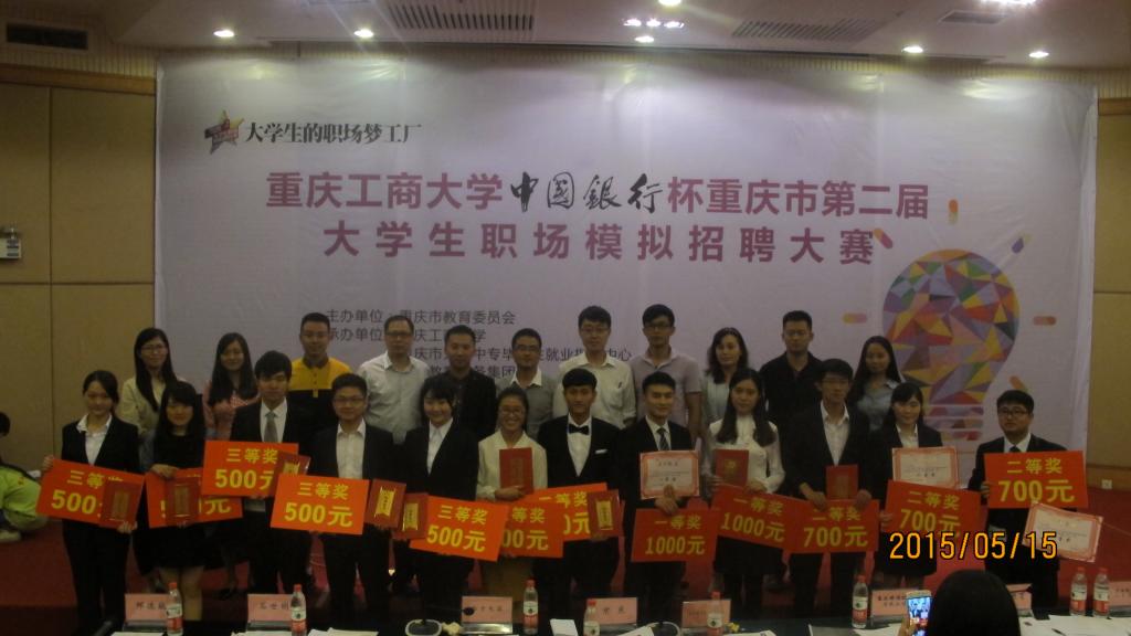 正和岛杯重庆市第二届大学生职场模拟招聘大赛暨太阳集团官网tyc9728第十六届职场模拟招聘大赛于   2015年   5月   15日   圆满落幕。本次决赛共评选出一等奖2名,二等奖4名,三等奖6名,优秀奖48名。我院12级金融一班的孔胜蓝斩获一等奖,得到奖金1000元;12级工商二班的孙樱菊和14级国贸一班的乔一龙分别荣获三等奖,获得奖金500元,其中乔一龙是入围选手中唯一的大一学生。