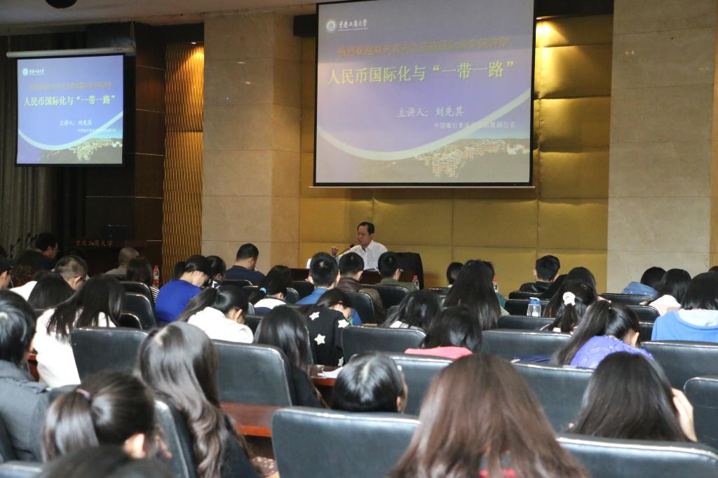 为浓厚我院学术氛围,扩大师生对国家经济金融形势的进一步了解。11月13日下午14:00,中国银行重庆分行高级副行长刘先其应邀来我院开展学术交流,并在田家炳学院408学术报告厅作学术报告。刘先其高级副行长以人民币国际化与“一带一路”为主题,为我校本科生带来了一场高质量的学术报告。我院200余名师生代表参加了报告会。