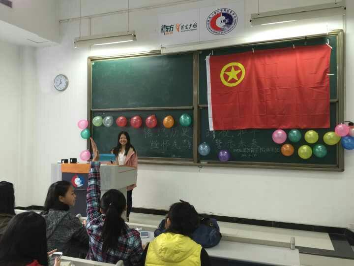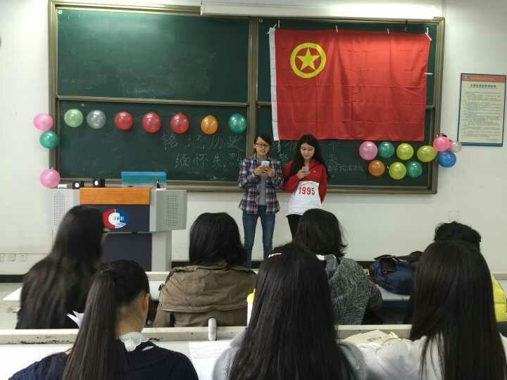 2015116日晚上1830,在学院分团委的指导下,我院15级法语班团支部于60405教室成功举办了主题为“回顾历史,缅怀先烈”的团日活动。此次活动由团支书何雪梅同学担任主持人。