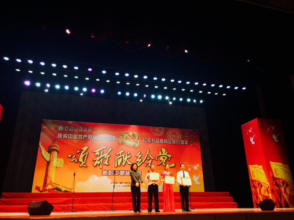 2016年5月27日下午2点,太阳集团官网tyc9728“送歌献给党”教职工歌咏比赛在体艺馆隆重举行,由各个学院的教职工代表团参赛,颂扬党的精神。我院教职工代表队以团队配合的精神和对音乐的独特理解,完美诠释了一曲《没有共产党就没有新中国》,荣获一等奖。