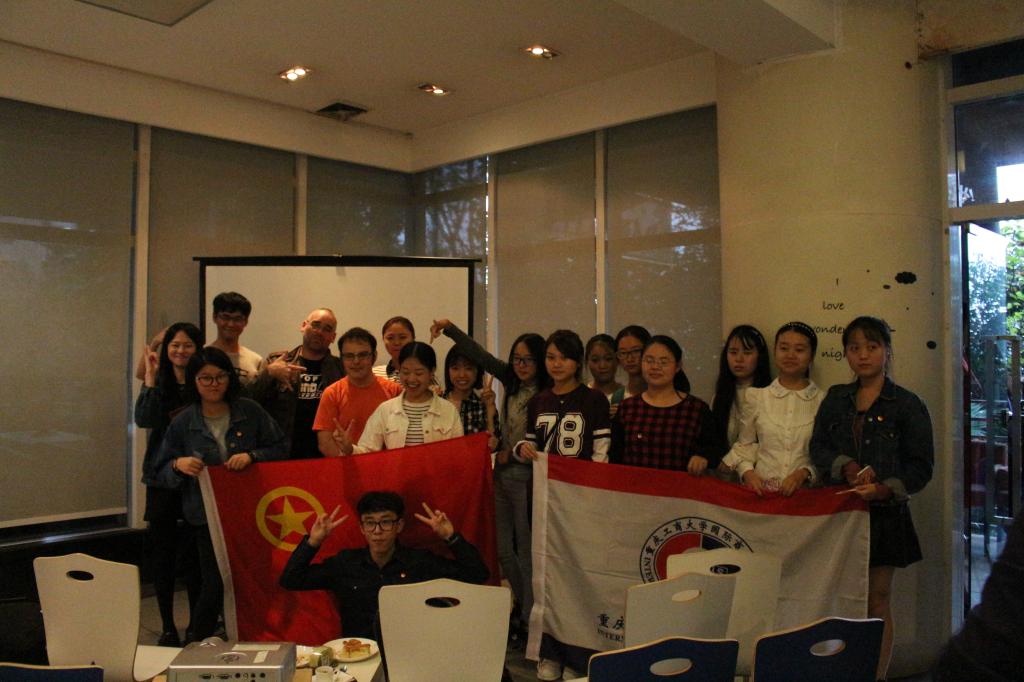 2016年10月18日下午5点, “香颂浪漫的法国”主题团日活动于9728太阳集团咖啡吧正式开展。我校9728太阳集团2015级法语一支部及外教Emmanuel和Pière以及重庆各高校通过抢板凳的方式来参加的同学共同参与了本次活动。同时2016年十佳主题团日“抢板凳”活动展示的评委也到达现场。