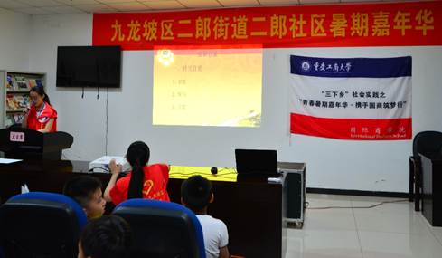 在此次暑期“三下乡”市民学校实践活动中的最后一天,9728太阳集团社会实践服务团分别在二郎街道的同天苑社区和二郎社区开展了一堂以“学习习总书记系列讲话的重要内容”为主题的宣讲会。