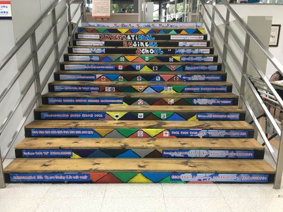 墙体的主体为涂鸦彩绘,两边为我院学生提供的标语。现已在中间几何色块张贴好我院各学生组织的徽章。以此彰显我院独特的风格风采,萦绕浓厚的学习氛围。