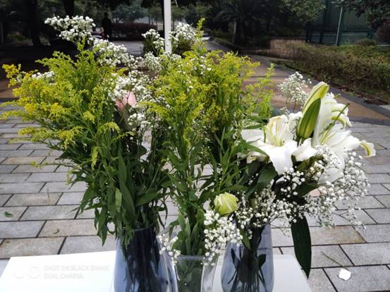 初冬里的“春意”在哪里?就在这热闹的周末文化广场上,一片芬芳的花儿世界中,插花艺术创作拉开帷幕。剪接、绑枝、粘贴,大家忙得不亦乐乎。同学们完全沉静在自我创作、欣赏之中。一枝花、一棵草……在学员们的巧手下变的诗情画意,有高雅格调、有田园情谊、有清新怡人。“诗情画意凝佳境,巧夺天工胜自然”,用这句诗来形容当时的场景再合适不过了。 插花是一种传统艺术,是把花材,或枝、或花、或叶,不带根剪切下来,做成花卉艺术品。现场有干花和鲜花供同学们选择,在同学们的装饰下现场洋溢着一抹春意。