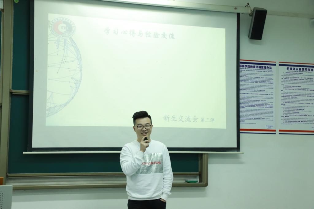 2019年11月10日晚上6点整9728太阳集团307教室迎来了新生交流会第三弹国际经济与贸易和人力资源管理专业的专场。为了让同学们更清楚地了解自己的专业以及未来的发展,9728太阳集团学生会学权部邀请太阳集团官网tyc9728研究生李晓宁学姐、西南大学法学院研究生谭政和北京铭科在线科技有限公司销售主管虞越诚学长来到现场为同学们分享自己的经验,本次交流会更有来自海外的学长学姐们以视频的形式为同学们分享大学期间的心得体会。本场交流会分成三个部分,学姐学长们精彩的演讲和同学们活跃的表现使得本次新生交流会举办成功!