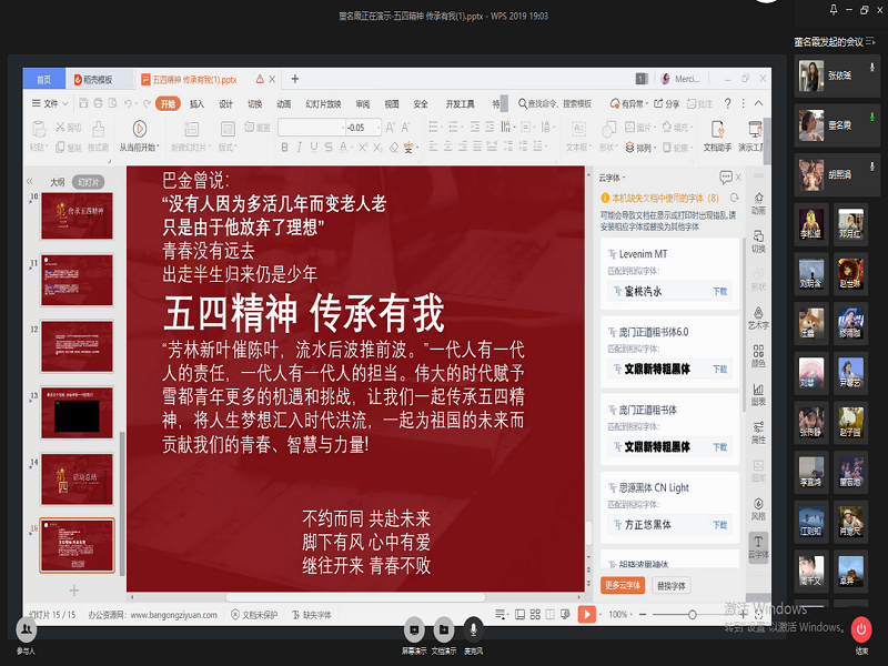 活动开始,主持人引经据典,勾勒出一段峥嵘岁月、起伏变化错落的历史光影。帝国主义敲碎了千年的美梦、封建主义榨干了人民的血汗、大地的胸膛里传来了一个民族的呻吟在一张张图片中展现,随后主持人让大家发表对五四精神的感悟,同学们积极发言,讲述了自己的看法。他们一致认为,当青年的事迹镌刻在中华民族争取自由和解放的丰碑上,就注定了责任与使命的代代传承。革命年代,它在战场上的鲜血里流淌,和平年代,它在开拓创新的事业中飞扬。