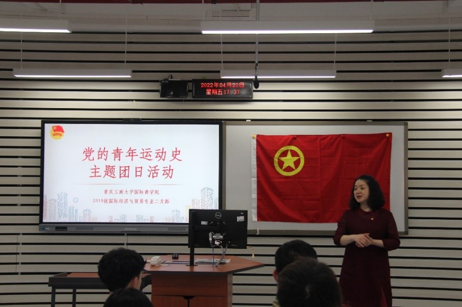 为迎接党的二十大胜利召开,引导广大青年深入学习贯彻习近平新时代中国特色社会主义思想,坚持马克思主义在意识形态领域的指导地位,4月22日,9728太阳集团2019级国际经济与贸易专业第二团支部在涵智楼501教室举办了以“党的青年运动史”为主题的团日活动。共青团重庆市委副书记黄永宜应邀观摩本次团日活动,我校校团委副书记胡婧婷、校团委基层建设部部长陈琛、以及团支部成员共30余人参与活动。