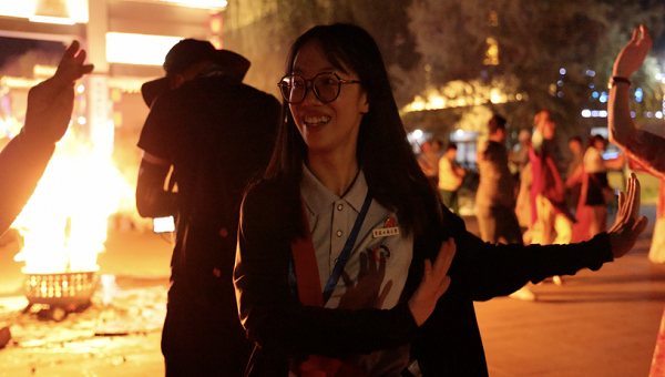 在欢快的歌舞表演后,实践团成员代表陈鹏远、卢昕毓作为此次活动的青年大学生代表接受CGTN中国国际电视台采访。陈鹏远表示,“你好,丝路”的篝火晚会别出心裁,多姿多彩,作为青年学生,自己内心触动颇深,极大的民族自豪感油然而生,今后将在国家富强、民族团结的伟大征程上贡献自己的青春力量。(文/陈彦甫 图/李祎喆)