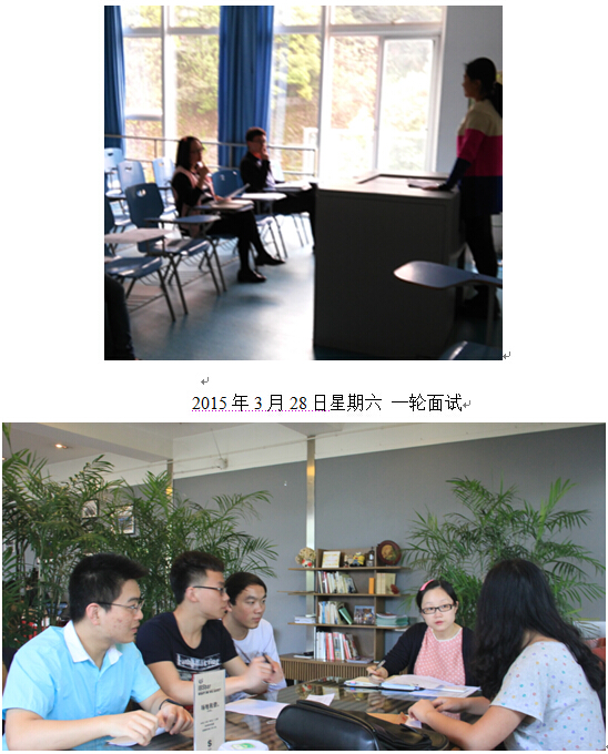2015年3月28日,上午九点,我院聚创社首届招新面试在60401教室顺利开展,学生辅导员、聚创社指导老师冯诗淇老师以及聚创社筹备组人员参加了此次面试并担任面试官。