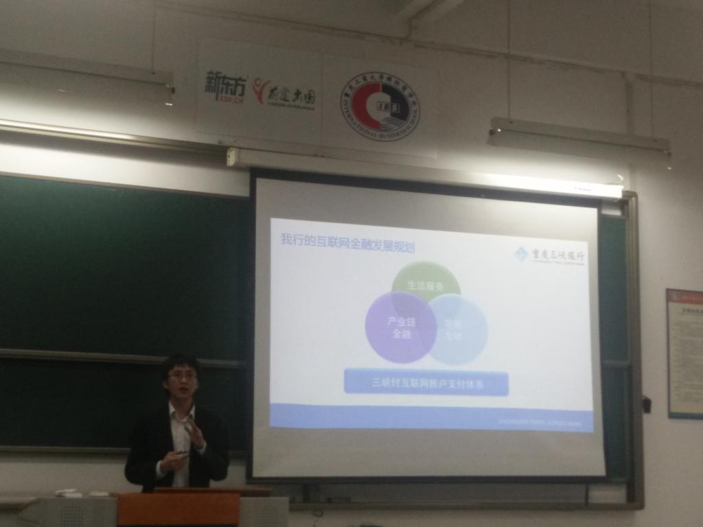 2016年4月22日14时30分,我院重庆三峡银行金融人才实验班第四讲如期而至,主讲人是三峡银行平台金融部主管陈诗恩先生,课程主题为互联网金融。