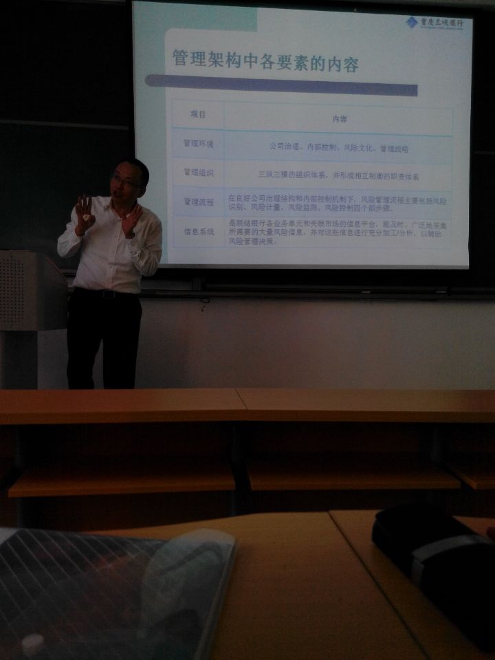 2016年5月20日14时30分,重庆三峡银行金融人才实验班第八讲正式开始,课程主题是银行风险管理基础以及法律风险防范,主讲人是三峡银行风险管理部总经理汪先俊先生。