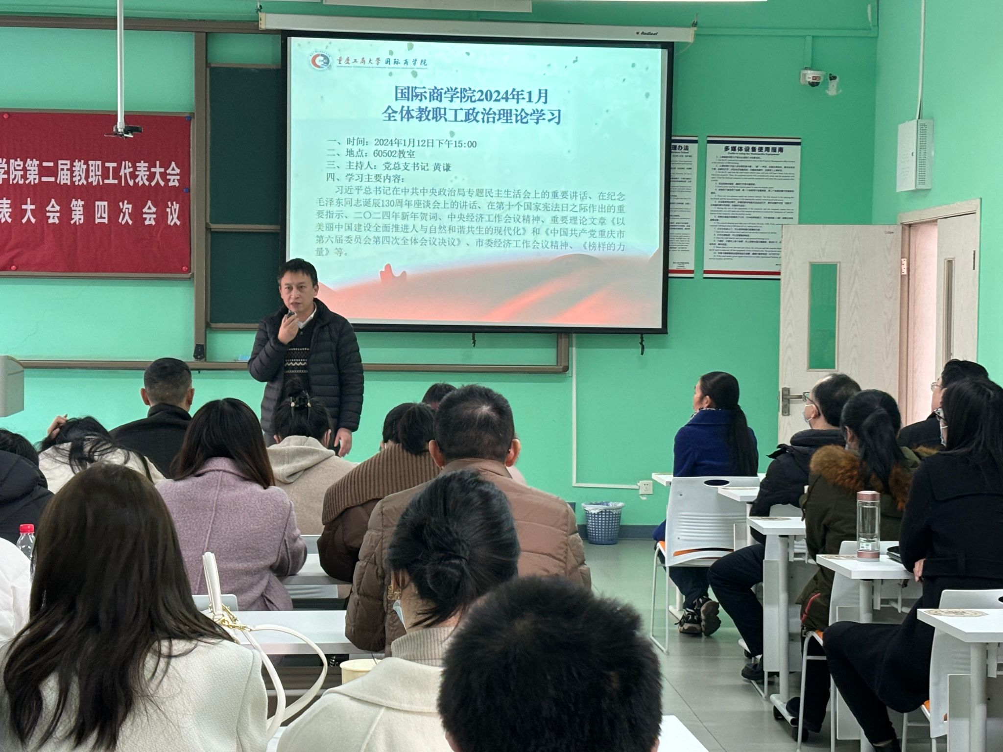2024年1月12日下午3点,学院组织全体教职工于502教室进行政治理论学习,深入学习贯彻习近平新时代中国特色社会主义思想。学习活动由党总支书记黄谦主持。