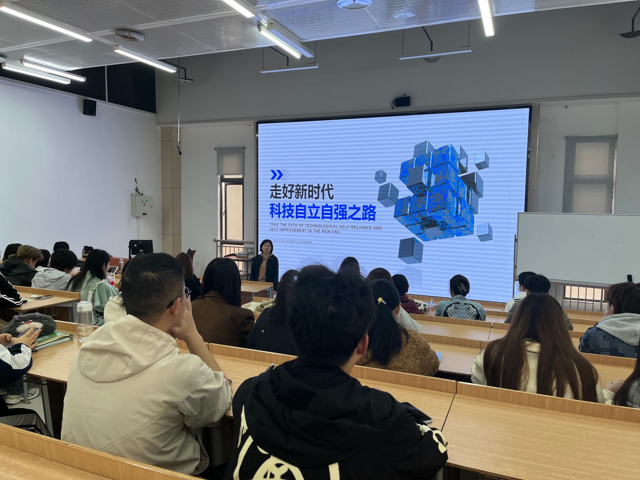 课堂上,柏群从我国的科技实力现状入手,介绍了当前国际创新格局的新形势;通过和现场学生互动,深入讲解了当前世界科技竞争的新情况、我国科技在各领域取得的新成绩及当前我们处在百年未有之大变局情况下面临的新挑战。鼓励学生要努力学习,在科技创新中展现青年担当。
