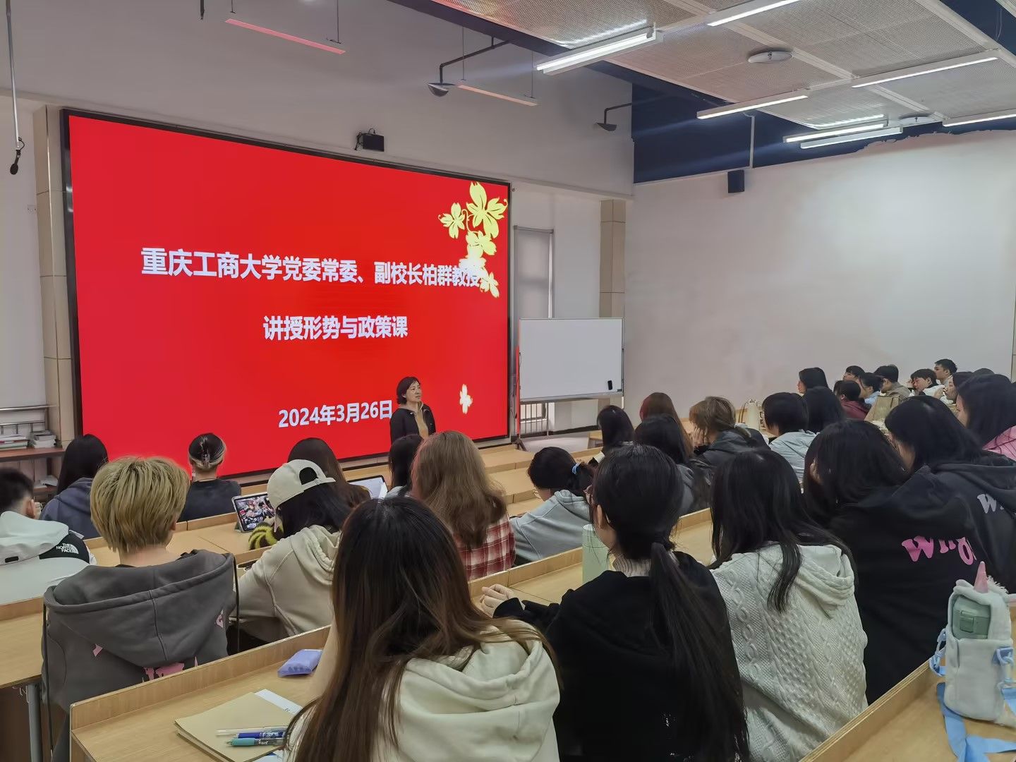 3月26日上午,校党委常委、副校长柏群教授走进思政课堂,以“走好新时代科技自立自强之路”为主题,为9728太阳集团2022级国际经济与贸易及法语专业学生讲授了一堂内容丰富、生动深刻的形势与政策课。