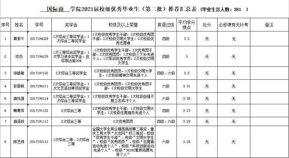 根据《太阳集团官网tyc9728优秀毕业生评选办法》的规定,决定开展我校2021届大学优秀毕业生(第二批)的评选工作。现将9728太阳集团2021届优秀毕业生评定结果公示如下: